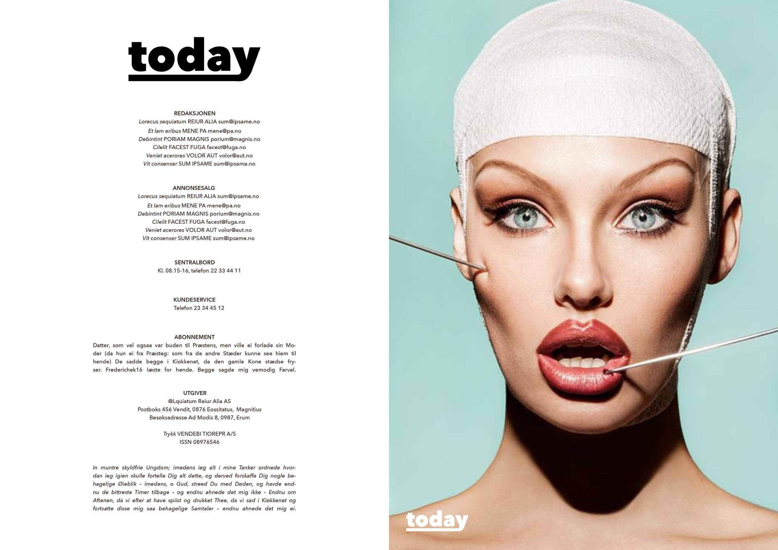 NTNU Gjøvik. Magasinet foretar seg samfunnsrelaterte problemer og debatter som gjenspeiler hva som er aktuelt i dagens samfunn. Tema er: ungdommer i dagens samfunn står ovenfor et enormt press vi ikke har sett maken til tidligere. De må prestere bra på skolen, ha jobb, tjene masse penger og bygge opp en bra karriere. Ikke nok med det, så følger det med et press fra sosiale medier hvor alt handler om followers, kropp og kosthold, drømmeferier og merkeklær. Dette magasinet tar for seg nettopp dette, bare med en vri; ironi og overdrivelse. Det er viktig å ikke ta seg selv alt for høytidelig, vi kan ikke være best i alt eller ha det som for mange er uoppnåelig. Å gjøre narr av «dagens image» er på mange måter en påminnelse av hva som egentlig er «normalt» for dagens unge generasjon. Magasinet foretar seg samfunnsrelaterte problemer og debatter og har dermed fått navnet «today» som gjenspeiler hva som er aktuelt i dagens samfunn. Meningen/konseptet for magasinet er at hvert nummer skal omhandle et tema som alltid gjøres narr av, er ironisk, spiller på overdrivelse, og har gjerne forstyrrende/upassende bilder som skal vekke interesse hos leseren. Poenget er å vise bilder av virkeligheten, med valg av bilder som man vanligvis ikke er vant med å se.